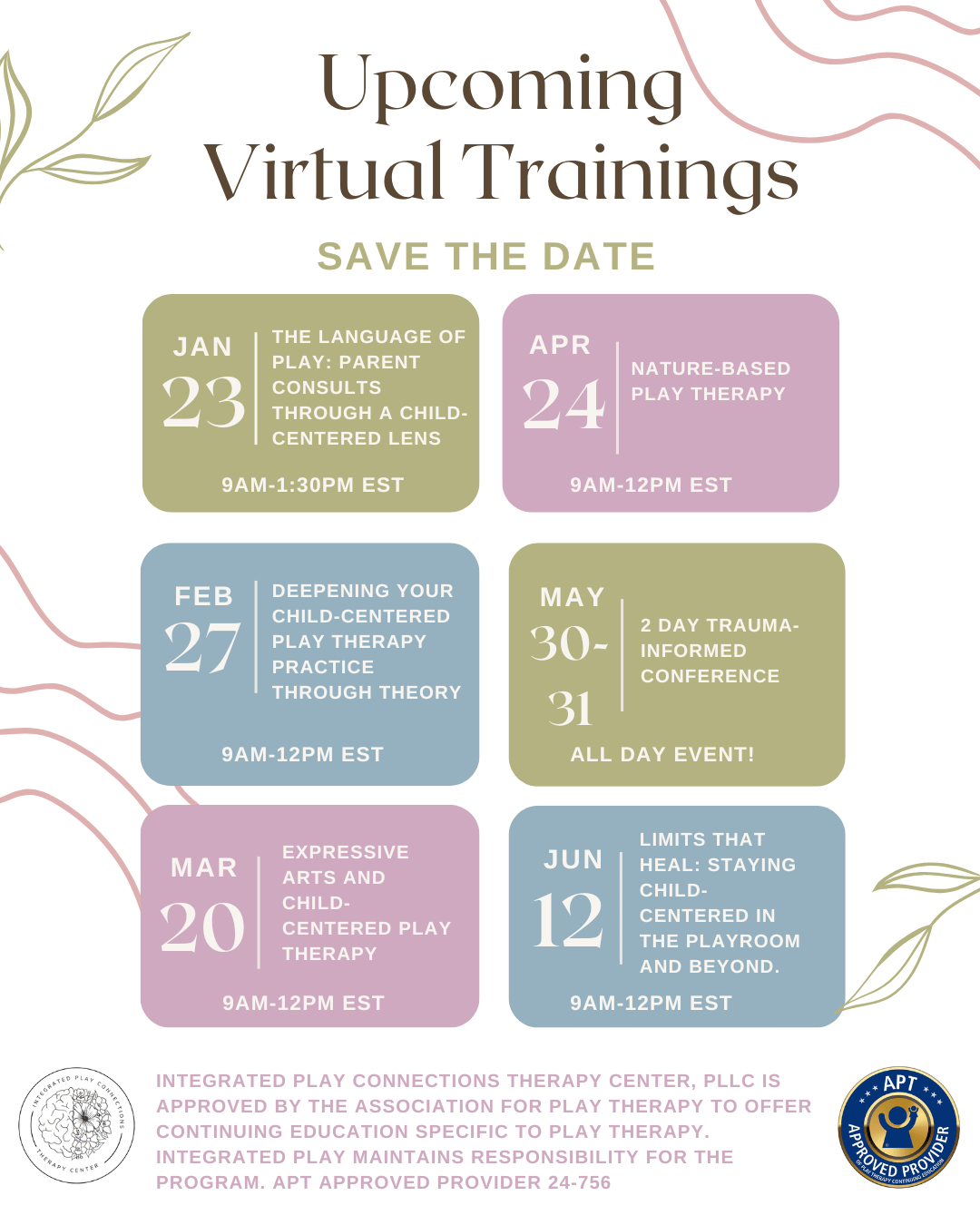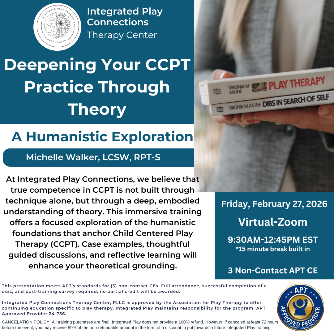 Integrated Play Connections Therapy Center, PLLC is approved by the Association for Play Therapy to offer continuing education specific to play therapy. Integrated Play maintains responsibility for the program. APT Approved Provider 24-756